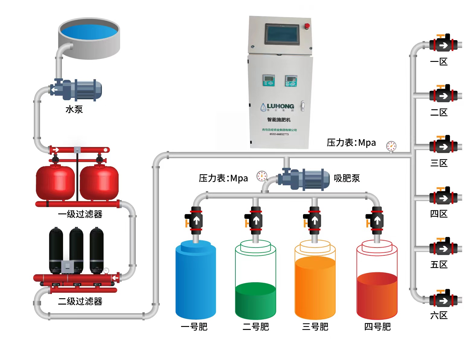 (2)省時省力一一可迅速滿足幾百畝大麵積灌溉和施肥,自動混肥攪拌,減少人工;