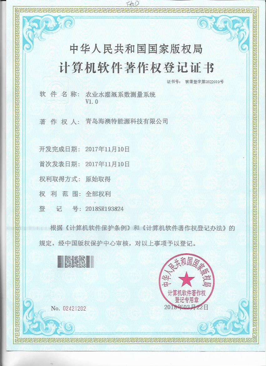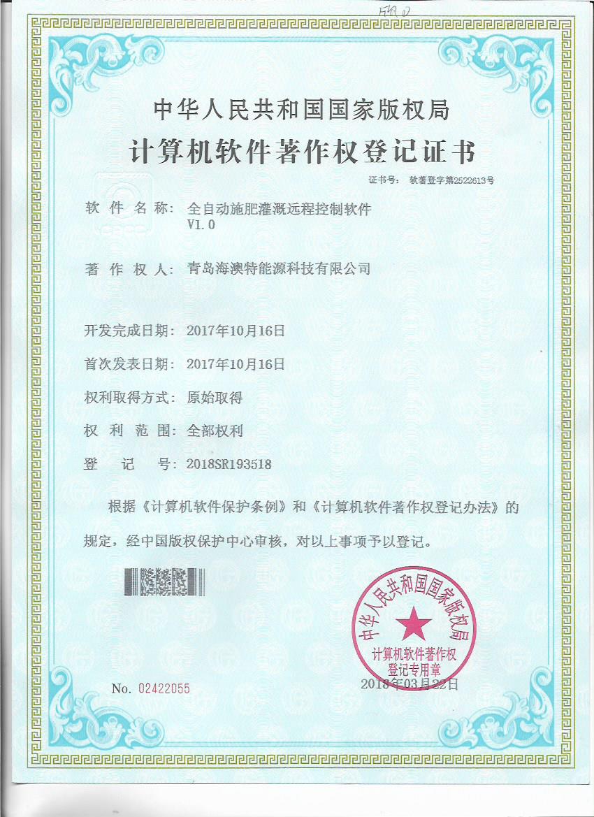 日前,青島海澳特能源科技有限公司獲得“全自動施肥灌溉遠程控製軟件V1.0”等五個計算機軟件著作權登記書。青島海澳特能源科技有限公司肩負北京新型智慧農業研究院水肥一體化研究中心有關軟件開發、智能施肥機設計等技術工作,擁有一支實力較強的研發團隊,該軟件著作權的獲得,既是對研發成果的認可,也為公司技術發展提供了保障。
