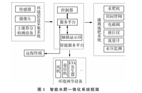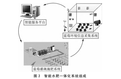 設計的麵向藍莓溫室的智能水肥一體化係統包括環境信息采集係統、智能服務平台、灌溉施肥係統以及其他環境調節設備,如圖2所示。