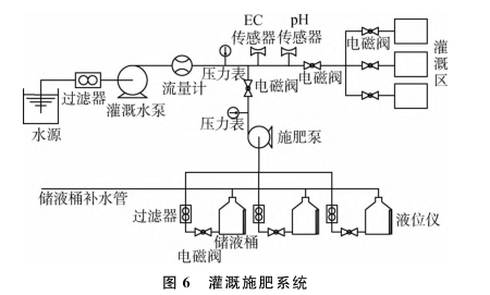 藍莓灌溉施肥係統也分為藍莓灌溉係統和藍莓施肥係統,如圖6所示。藍莓灌溉係統由灌溉水泵、過濾裝置、灌溉管路以及流量計、壓力表、電磁閥等組成。灌溉水依次經過濾器、灌溉水泵、流量計、壓力表、電磁閥、支管、毛管進入藍莓溫室,滴灌管連接在毛管上,每一行藍莓均有一排滴灌管,以保證灌溉的效率和均公性。藍莓施肥係統由施肥泵、儲液罐、過濾器、電磁閥、施肥管路以及液位高度傳感器、EC和pH傳感器等元器件組成。肥液依次經過儲液桶、電磁閥、過濾器、施肥泵、壓力表、電磁閥注入灌溉管路,並通過EC和pH傳感器檢測水肥混合液的EC值和pH值。
