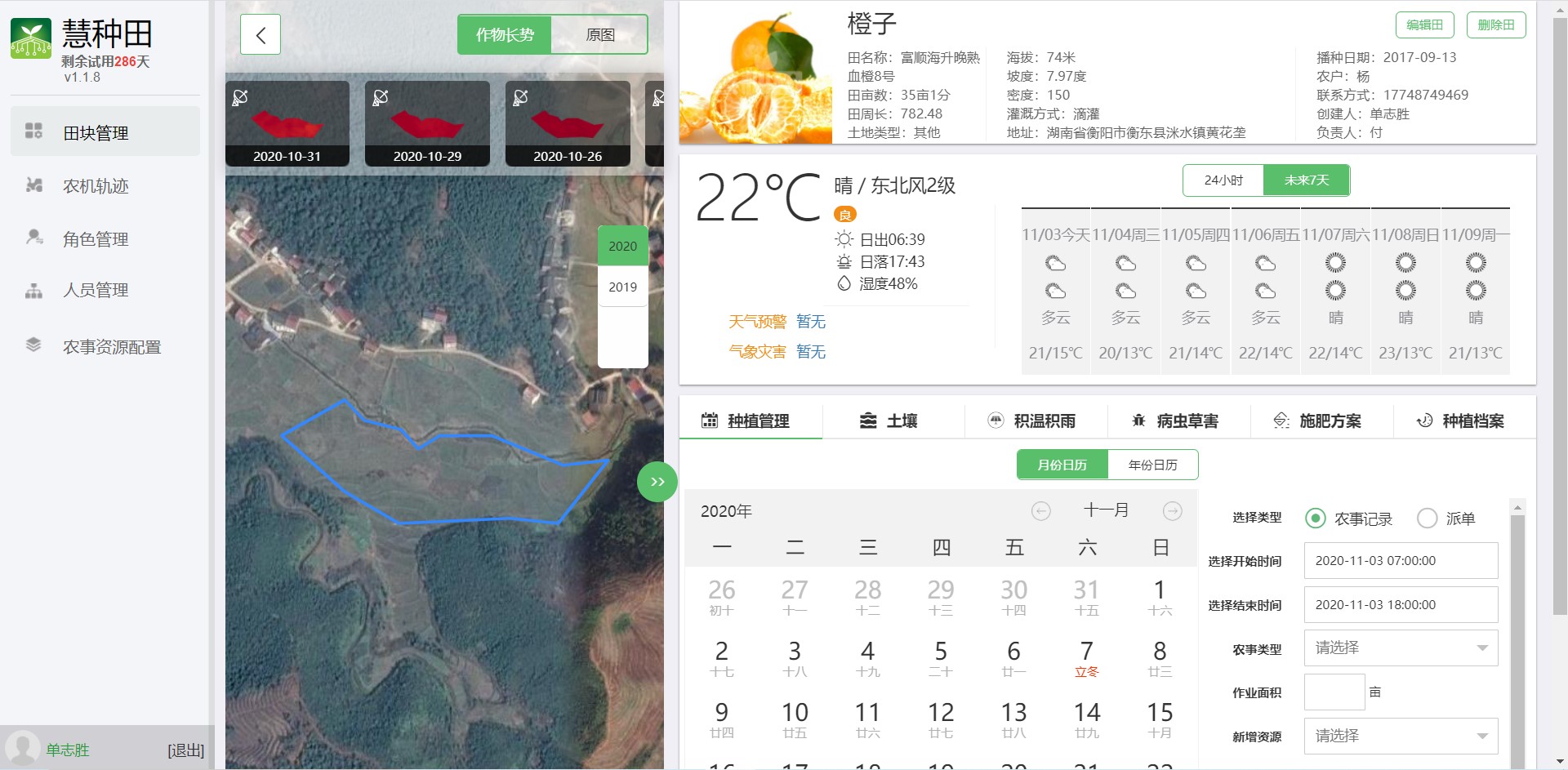 該平台根據24節氣、氣象條件、土壤條件,提供科學種植指導,為農民包產增收;同時集農機農田劃分、農植物選擇、人員管理、農機軌跡設定於一體,使種植更加科學化、合理化,省時省力。